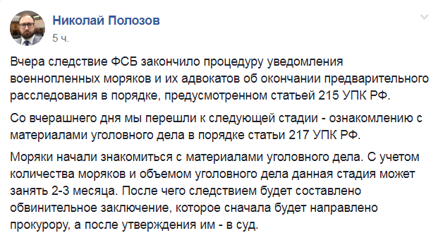 "Вчера следствие ФСБ закончило процедуру уведомления военнопленных моряков и их адвокатов об окончании предварительного расследования в порядке, предусмотренном статьей 215 УПК РФ", - написал юрист.