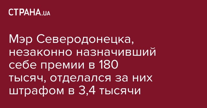 Мэр Северодонецка обязали заплатить штраф в 3,4 тысячи гривен за назначение себе премий в десятки тысяч в течение года. С января по сентябрь 2018 он выплатил себе более 155 тыс. грн премии и 21 тыс. грн материальной помощи. Об этом сообщает пресс-служба прокуратуры Луганской области.