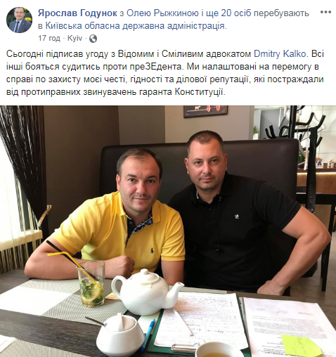 "Сегодня подписал соглашение с известным и смелым адвокатом Dmitry Kalko. Все остальные боятся судиться против ПреЗедента. Мы настроены на победу в деле по защите моих чести, достоинства и деловой репутации, пострадавших от противоправных обвинений гаранта Конституции", - написал Годунок.