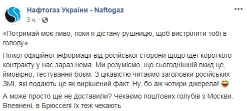 В компании "Нафтогаз Украина" заявили, что никакой официальной информации от российской стороны относительно идеи короткого контракта, озвученного в СМИ, у них сейчас нет, а саму идею такого контракта в НАК высмеяли. Об этом свидетельствует сообщение компании в Facebook.