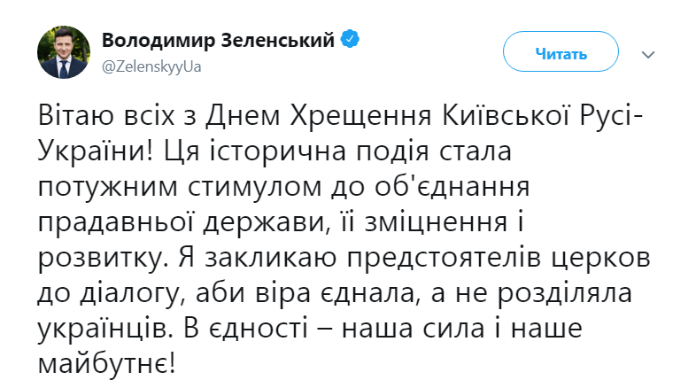 Интересно, что в своем поздравлении он использовал формулировку "Русь-Украина". Такую же используют сторонники Киевского патриархата и ПЦУ. В УПЦ же говорят "крещение Руси".