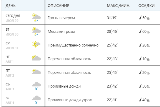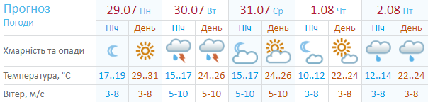 Прогноз Мeteoprog.ua сообщает, что с +31 в понедельник температура скатится до +21 в течение недели. Дождь в Киеве обещают 29-30 июля, а также 3 августа. Воскресенье, 4 августа, по данным этого ресурса, будет солнечным - воздух прогреется до +21.