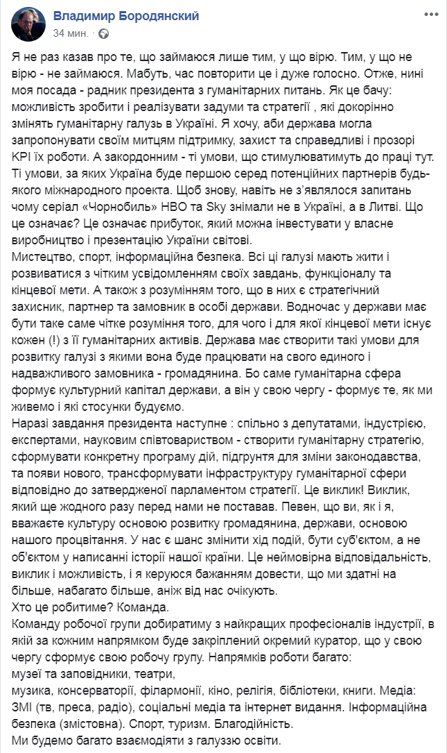 "Итак, сейчас моя должность - советник президента по гуманитарным вопросам. Как это вижу: возможность сделать и реализовать замыслы и стратегии, которые в корне изменят гуманитарную отрасль в Украине", - написал новый советник.