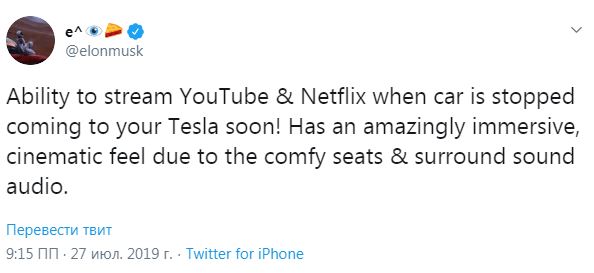 По его словам, для просмотра видео можно использовать большой монитор, который устанавливается в салоне электрокаров Tesla. "Благодаря объемному звуку и удобным сидениям в автомобилях Tesla будет непередаваемое ощущение кинематографичности", - написал Маск.