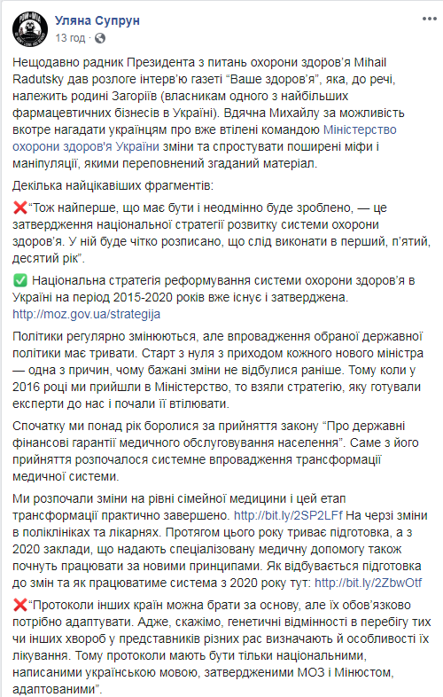 Это заявление Михаила Радуцкого вызвало жесткую критику со стороны Ульяны Супрун, о чем она написала в своем Facebook.
