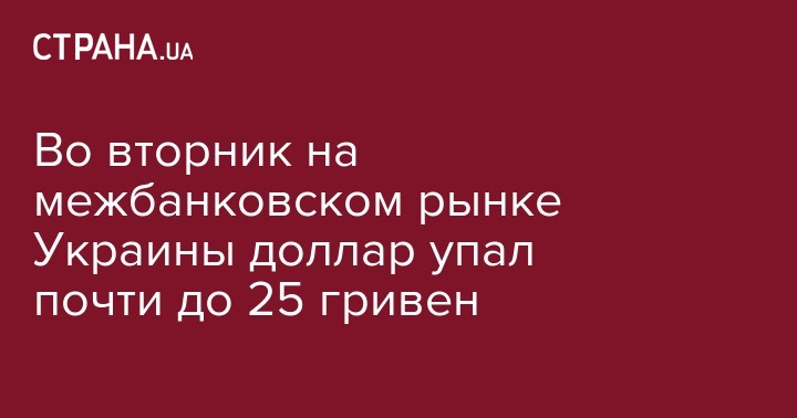 Курс гривни на межбанковском валютном рынке во вторник укрепился до 25,035 грн/$1 с 25,2275 грн/$1 в предыдущий рабочий день. Об этом сообщает "Интерфакс-Украина" со ссылкой на дилеров коммерческих банков.
