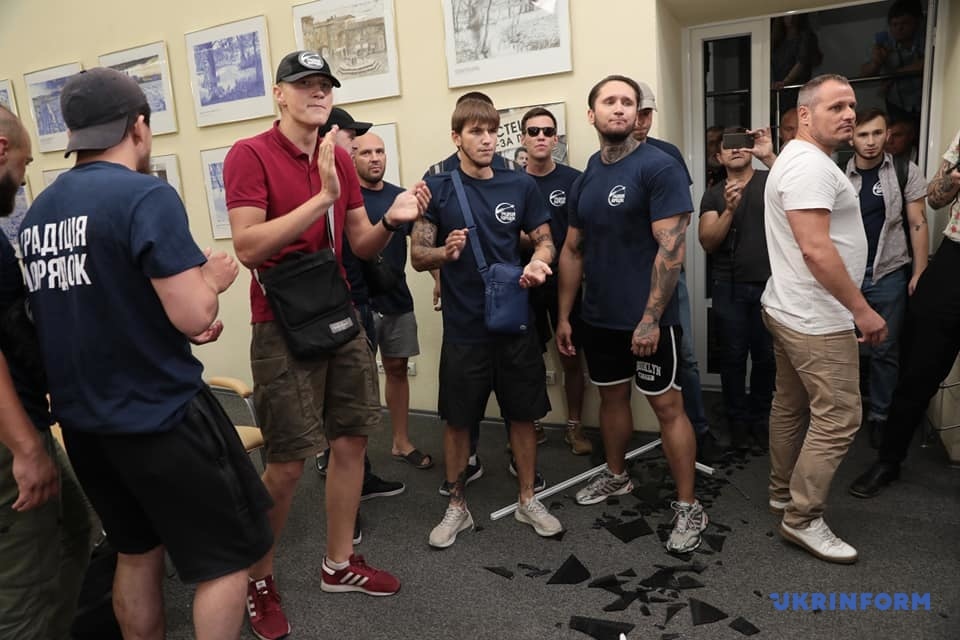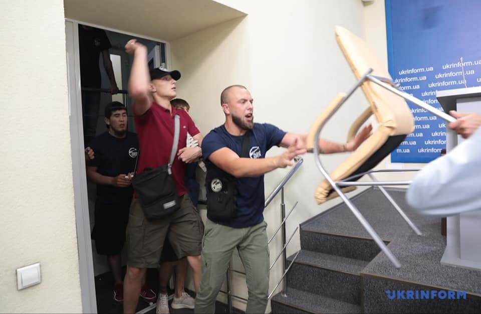 В агентстве Укринформ закрыли свой первый пресс-зал, после того, как на него напали молодчики в футболках "Традиция и порядок", повредив оборудование.