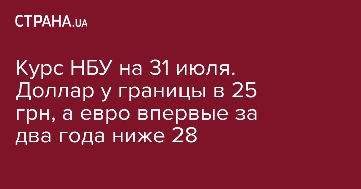 Национальный банк Украины (НБУ) на 31 июля 2019 года установил официальный курс доллара на уровне 25,08 гривен за доллар, что еще на 17 копеек ниже по сравнению с предыдущим банковским днем. Об этом свидетельствуют данные на сайте регулятора.