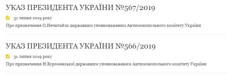 Соответствующие указы президента Украины №566/2019 и №567/2019 от 31 июля опубликованы в среду, 31 июля пресс-службой главы государства. Ольга Нечитайло до назначения в АМКУ была экспертом энергетического сектора Офиса эффективного регулирования (BRDO), а Наталья Буроменская – адвокат.