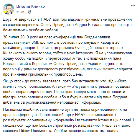 30 июля 2019 на пресс-конференции господин Богдан заявил представителям СМИ, что ему, в разговоре, предлагали взятку в 20 миллионов долларов. И, якобы, этот разговор был осуществлен ​​в интересах Киевского городского головы, то есть в моих интересах. Я не уполномочивал ни одно лицо на подобные "переговоры"! А такие высказывания господина Богдана, который является руководителем Офиса президента Украины, подлежат проверке в рамках досудебного расследования, поскольку могут свидетельствовать о совершении уголовных преступлений.