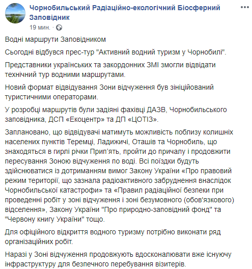 Также отмечается, что для официального открытия водного туризма нужно выполнить ряд организационных работ. Сейчас в зоне отчуждения продолжают совершенствовать уже существующую инфраструктуру для безопасного пребывания визитеров.