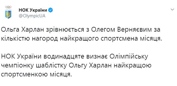 Национальный олимпийский комитет Украины в одиннадцатый раз признал Ольгу Харлан лучшей спортсменкой месяца. Об этом сообщает НОК Украины в Twitter.