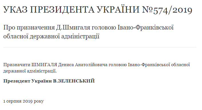 Президент Украины Владимир Зеленский назначил Дениса Шмыгаля новым главой Ивано-Франковской областной государственной администрации. Соответствующий указ №574/2019 от 1 августа опубликован на официальном сайте главы государства в пятницу.