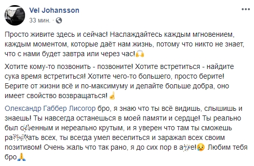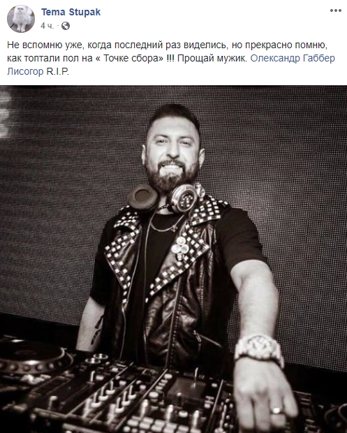 "Саша был с нами начиная с первых вечеринок. Человек улыбка. Постоянно отдавал энергию. Многие настоящие панки, рок-н-рольщики уходят из жизни рано. Саша был именно таким - максимально настоящим. Еще вчера он рассказывал друзьям о мотоцикле, планы, а сегодня его с нами уже нет. Жизнь несправедлива", - написал Александр Барабошко.