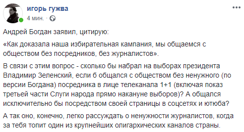 Главный редактор "Страны" Игорь Гужва спросил, сколько бы набрал на выборах президента Владимир Зеленский, если бы общался с обществом без ненужного, по версии Богдана, посредника в лице телеканала 1+1.