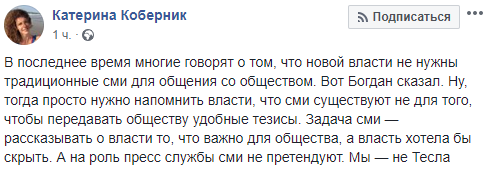 "В последнее время многие говорят о том, что новой власти не нужны традиционные CМИ для общения со обществом. Вот Богдан сказал. Ну, тогда просто нужно напомнить власти, что СМИ существуют не для того, чтобы передавать обществу удобные тезисы. Задача сми - рассказывать о власти то, что важно для общества, а власть хотела бы скрыть. А на роль пресс службы СМИ не претендуют. Мы - не Тесла", - написала журналист Катерина Коберник.