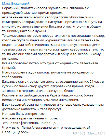 "Соратники, политтехнологи, журналисты, связанные с предыдущей властью, кричат криком. Аки раненые звери воют о свободе слова, убийстве сми и катастрофе, которая должна наступить примерно с минуты на минуту с момента заявления Богдана о том, что они, в общем то, никому на@ не нужны. Те самые люди, которые превратили сми в посмешище и позор, которые скупали пачками журналистов, ломов и телеканалы, подвешивали собственников сми на крючки уголовных дел и травили сми ручными активистами, вдруг озаботились тем, что то, во что они эти сми превратили, в общем то, особо никому не нужно.