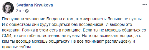 "Послушала заявление Богдана о том, что журналисты больше не нужны. И с обществом они будут общаться без посредников. И выборы это показали. Логика в этом есть в принципе. Если ты не можешь общаться со СМИ, то они тебе естественно не нужны. Но тогда возникает вопрос, а с кем ты вообще можешь общаться? Не все понимают распальцовку и цыканье зубом".