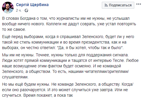 Главный редактор "РБК-Украина" Сергей Щербина написал, что люди хотят прямой коммуникации но журналисты будут нужны обществу, когда оно разочаруется во власти.