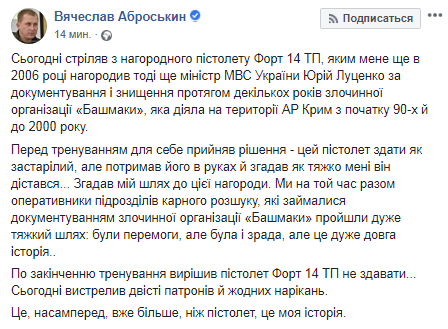"Сегодня стрелял из наградного пистолета Форт 14 ТП, которым меня еще в 2006 году наградил тогда еще министр МВД Украины Юрий Луценко за документирование и уничтожение в течение нескольких лет преступной организации "Башмаки", которая действовала на территории АР Крым с начала 90-х и до 2000 года", - написал Вячеслав Аброськин.