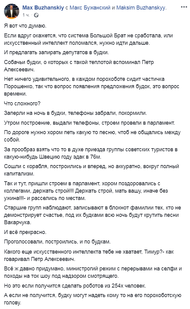 "Что сложного? Заперли на ночь в будки, телефоны забрали, покормили. Утром построение, выдали телефоны, строем провели в парламент. По дороге нужно хором петь какую то песню, чтоб не общались между собой... Проголосовали, построились, и по будкам", - написал Бужанский.