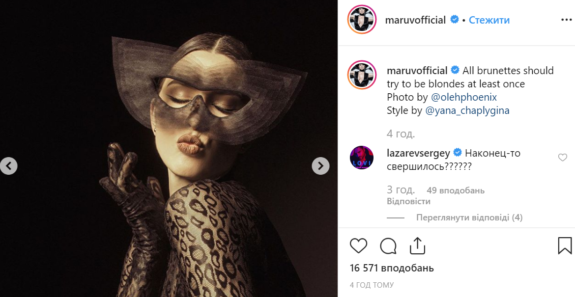Украинская певица Maruv, которая выиграла отбор на Евровидение-2019, но все равно не попала на конкурс, опубликовала в соцсети фото, на которых она запечатлена в кошачьем образе.