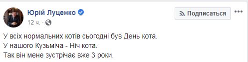 "У всех нормальных котов сегодня был День кота. У нашего Кузьмича - Ночь кота. Так он меня встречает уже 3 года", - написал глава ГПУ.