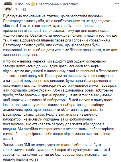 И несмотря на то, что по данным Госпродпотребслужбы, главным государственным инспектором Киева было принято решение о временном прекращении деятельности по производству и обороту пищевых продуктов этой сетью заведений, в іl Molino сообщили, что постановления о прекращении деятельности предприятия не было, потому что оснований для этого нет.