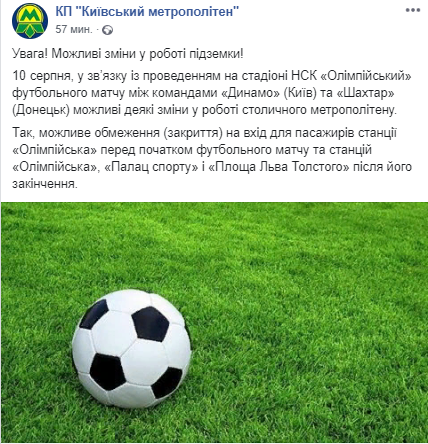 Вечером в субботу, 10 августа, стразу несколько станций метрополитена столицы могут изменить (ограничить) график работы из-за проведения на стадионе НСК "Олимпийский" футбольного матча между командами "Динамо" (Киев) и "Шахтер" (Донецк).