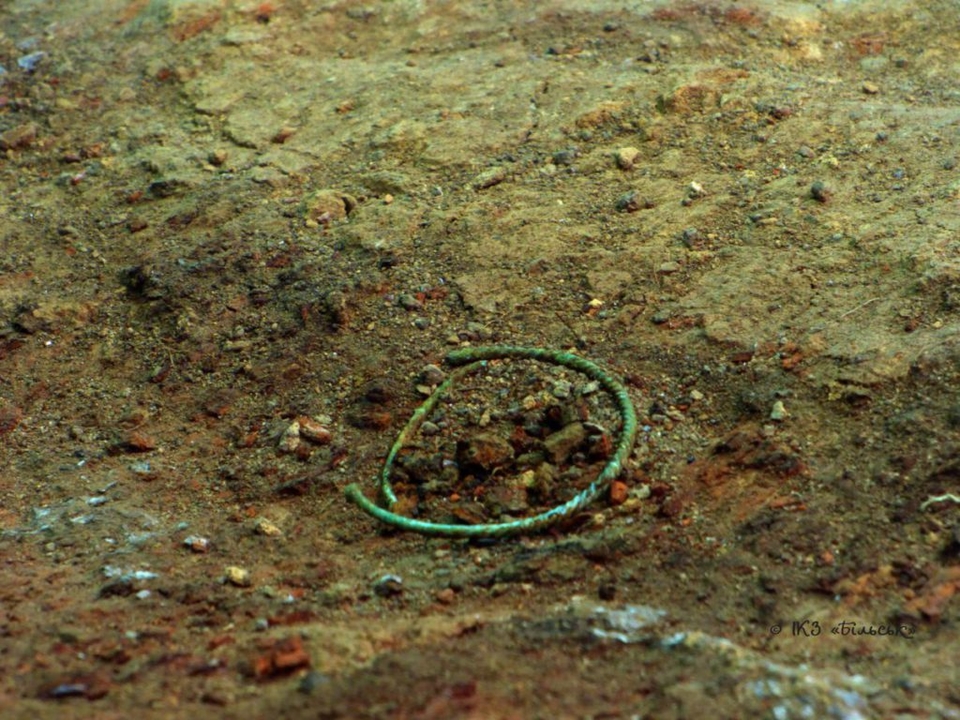 А также уточняется, что зеркало и браслет изготовлены из бронзы, бусины - из янтаря, хрусталя и сердолика, из желтого металла (золота) - серьги. От черпаков, кочерги, тарелок и другой керамики домашнего обихода остались только обломки.