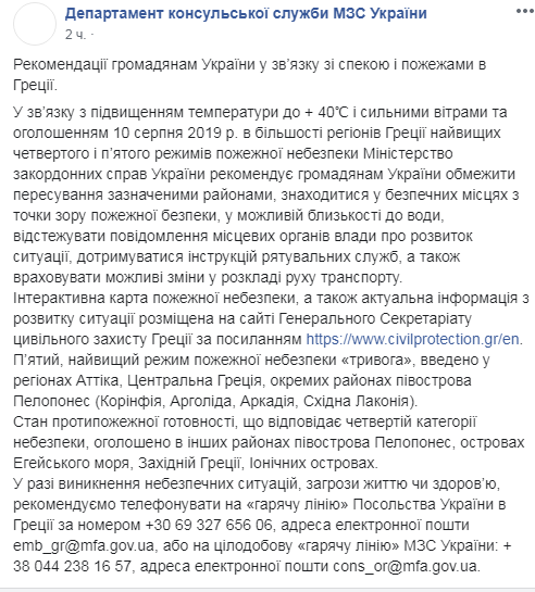 "В случае возникновения опасных ситуаций, угрозы жизни или здоровью, рекомендуем звонить на "горячую линию" Посольства Украины в Греции по телефону +30 69327656 06, адрес электронной почты emb_gr@mfa.gov.ua, или на круглосуточную "горячую линию" МИД Украины: + 38044238 16 57, адрес электронной почты cons_or@mfa.gov.ua", - сообщили дипломаты.