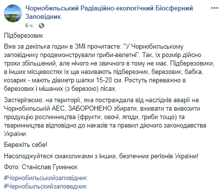 "Предостерегаем: на территории, пострадавшей от последствий аварии на Чернобыльской АЭС, запрещено собирать, использовать и вывозить продукцию растениеводства (фрукты, овощи, ягоды, грибы и т.д.) и животноводства в соответствии с приказами и правил действующего законодательства Украины", - подчеркнули в заповеднике.
