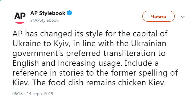 В Associated Press изменили написание в статьях Kiev на Kyiv. Но котлету по-киевски и впредь будут называть "chicken Kiev"