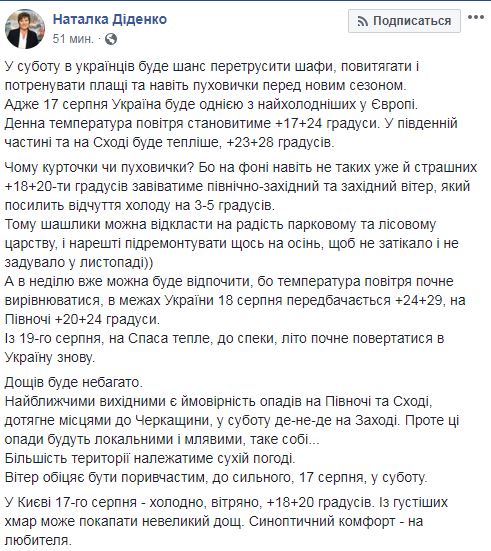 Завтра, 17 августа, Украина будет одной из самых холодных стран в Европе. Об этом синоптик Наталья Диденко сообщила в Facebook.
