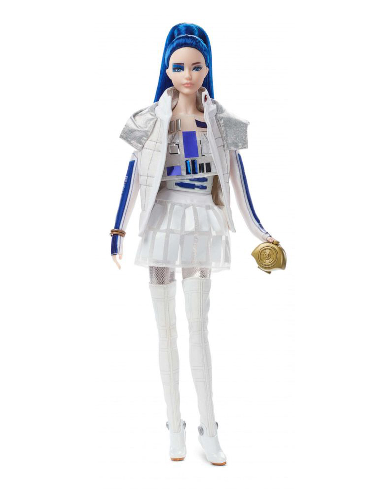 На третьей кукле, примерившей образ дроида R2-D2, белые ботфорты, кроп-топ, юбка-купол и бомбер с акцентными серебристыми и синими деталями. У нее также есть клатч, немного напоминающий приятеля её персонажа C-3PO.