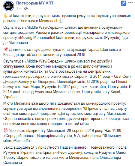 Само открытие скульптуры "Middle Way" состоится во время старта образовательно-художественной программы "Дни современного искусства в Николаеве" 20 августа, в 11:00. Мероприятие состоится в присутствии Чрезвычайного и Полномочного Посла Румынии в Украине господина Кристиана Леон Цуркану, консула Румынии в Одессе Тибериу Шарп и городского головы Александра Сенкевича.