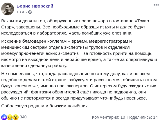 "Вскрытия девяти тел, обнаруженных после пожара в гостинице "Токио Стар", завершены. Все необходимые образцы изъяты и далее будут исследоваться в лабораториях. Часть погибших уже опознана.", - написал эксперт.