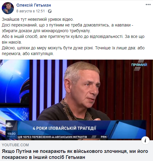 Участник АТО Гетьман и сейчас часто появляется на телеканалах в качестве военного эксперта. Он признается, что есть два пути к достижению мира: или победа, или капитуляция: "До сих пор уверен, что с Путиным не нужно договариваться, а наоборот - собирать доказательства для международного трибунала"...