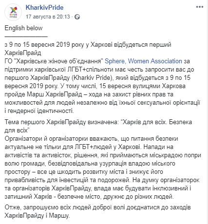"Тема первого ХарьковПрайда определена: "Харьков для всех. Безопасность для всех". Организаторы считают, что вопрос безопасности актуален не только для ЛГБТ + людей в Харькове. Нападения на активистов и активисток, решения, которые принимаются горсоветом вопреки воле общества, безответственная узурпация власти городского пространства - все это вредит развитию города и снижает его привлекательность для инвестиций и путешествий", - сказано в сообщении.