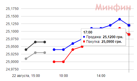 В четверг, 22 августа, курс опустился к 25 гривнам за доллар и лишь вмешательство Нацбанка и некоторых самых стойких покупателей удержало его от дальнейшего проседания. На межбанке доллар с утренних показателей 25,075/25,105 гривен просел до 24,99/2502 к середине дня, а затем чуть вырос до 25,03/25,065 к моменту завершения сессии.