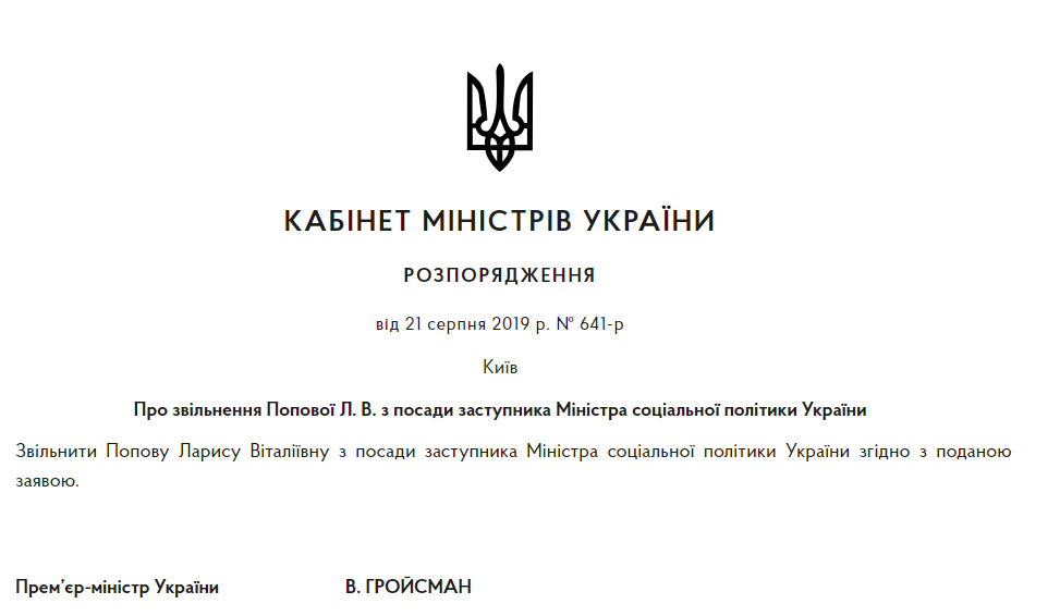 "Уволить Попову Ларису Витальевну с должности заместителя министра социальной политики Украины согласно с поданным заявлением", - сказано в распоряжении Кабмина №641-р от 21 августа.