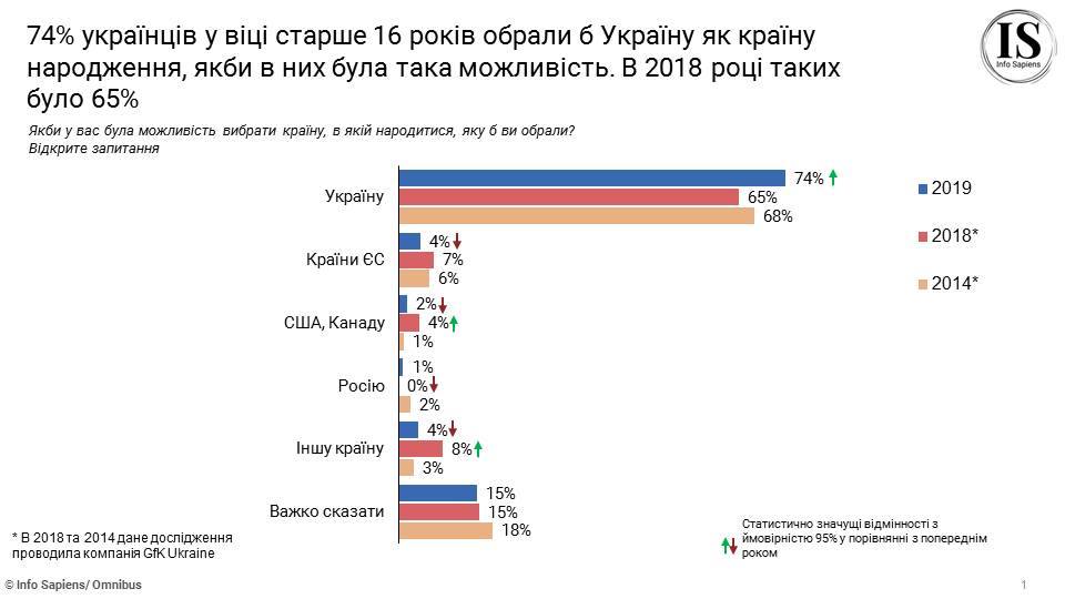 74% украинцев в случае, если бы имели возможность выбрать место рождения, предпочли бы Украину.  Об этом говорят результаты ежемесячного опроса Омнибус Info Sapiens, проведенного в июле 2019 среди украинцев старше 16 лет.