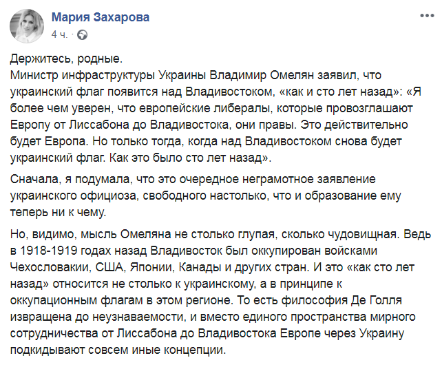 То есть Омелян подменил философию единого пространства мирного сотрудничества от Лиссабона до Владивостока идеей оккупации чужих земель, констатировала Захарова.