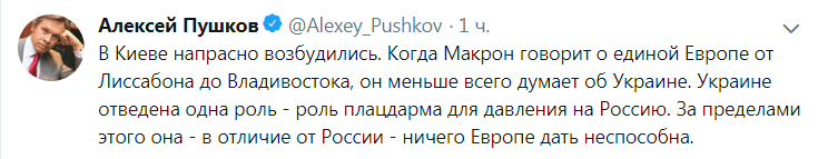 "В Киеве напрасно возбудились. Когда Макрон говорит о единой Европе от Лиссабона до Владивостока, он меньше всего думает об Украине. Украине отведена одна роль - роль плацдарма для давления на Россию. За пределами этого она - в отличие от России - ничего Европе дать не способна", - написал сенатор.