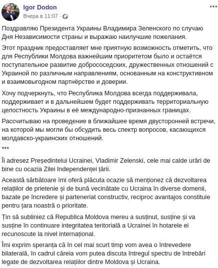Президент Молдовы Игорь Додон поздравил Украину с Днем независимости и заявил о том, что поддерживает территориальную целостность страны в тех границах, которые были признаны всем международным сообществом.