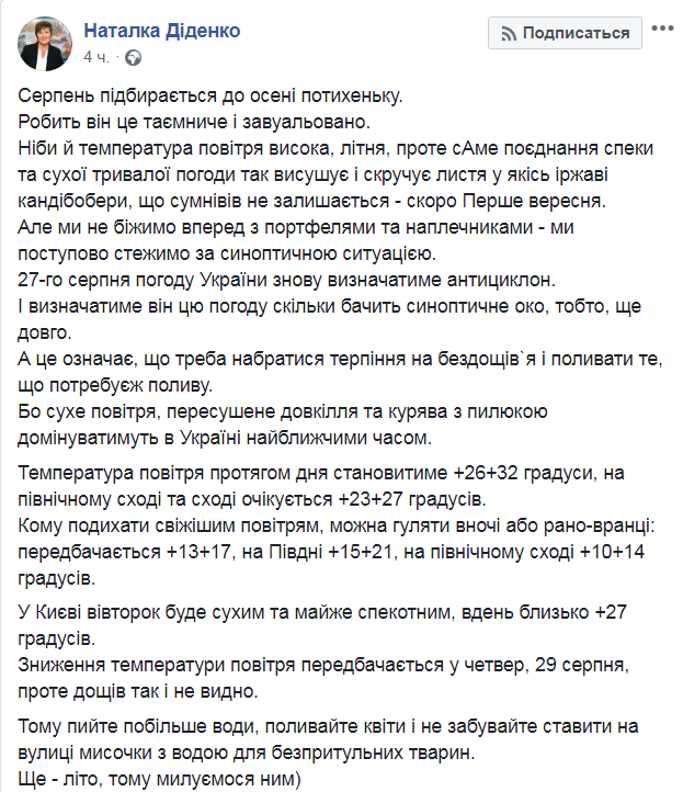 Вторник, 27 августа, обещает быть таким же жарким и ясным, как и первый день недели. Такой прогноз дает синоптик Наталья Диденко на своем Facebook.