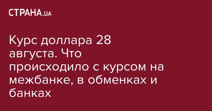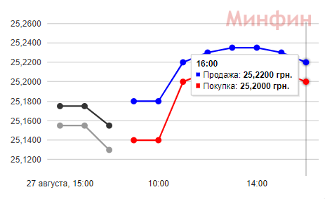 28 августа НБУ поднял курс доллара на 10 копеек - до уровня 25,1649 грн/$ по сравнению с предыдущим днем. В обменках доллар к вечеру покупают за 25,14 грн, продают за 25,18 грн. Межбанк закрылся следующими котировками: 25,20 грн - покупка и 25,22 грн - продажа. В банках к вечеру доллар в среднем покупают за 25,01 грн, продажа - 25,25 грн.