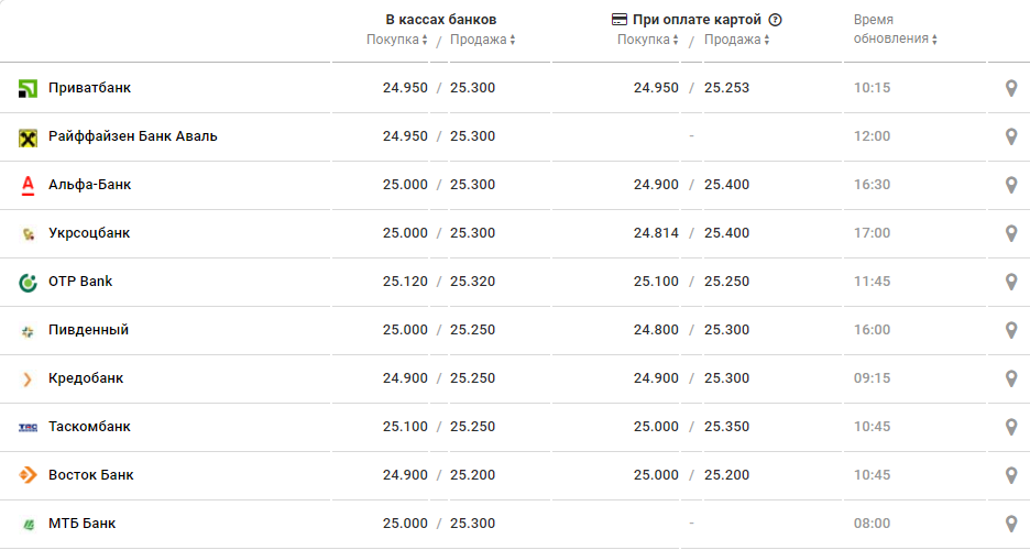 В банках средний курс доллара с утра был такой: покупка - 25 грн, продажа - 25,25 грн. Днем покупка, в зависимости от банка, была 24,80-25,17 грн, продажа 25,10-25,50 грн. к вечеру динамика не изменилась, в разных банках курс немного отличается.