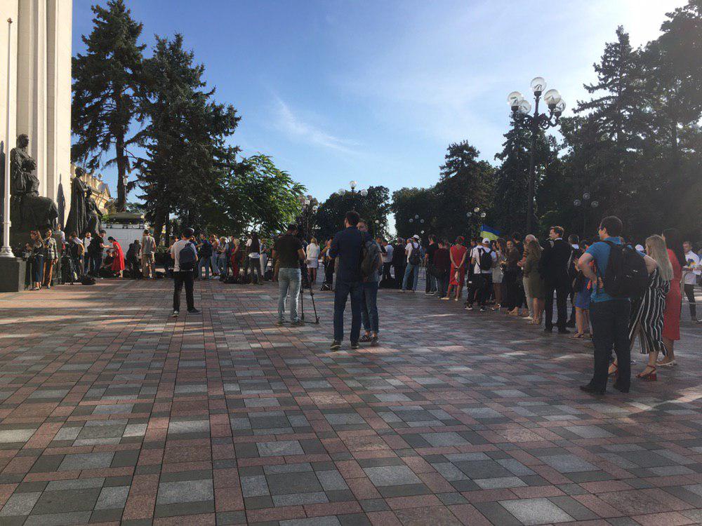 Корреспонденты и операторы начали занимать очередь с самого раннего утра. Некоторые пришли в 06:00. К 09:00 возле здания Верховной Рады собралось очень много людей.