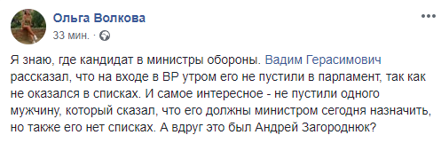 "Я знаю, где кандидат в министры обороны. Вадим Герасимович рассказал, что на входе в ВР утром его не пустили в парламент, так как не оказался в списках. И самое интересное - не пустили одного мужчину, который сказал, что его должны министром сегодня назначить, но также его нет списках. А вдруг это был Андрей Загороднюк?"- написала журналистка "Страны"